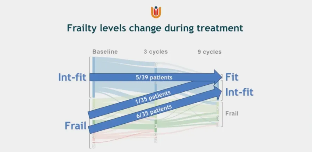 This slide provides a great graphic of frailty changes seen at the end of 3 cycles and 9 cycles of treatment: