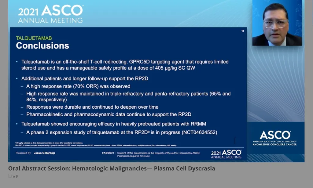 Jesus Berdeja, MD and Director of Myeloma Research at the Sarah Cannon Research Institute, Nashville, TN presented updates on the MonumenTAL-1 study of talquetemab at the higher dose of 405ug/kg subcuteneous weekly. A Phase 2 study is in progress. The main data is captured in the slide below.