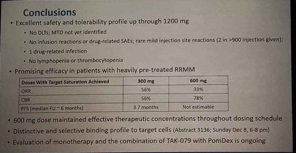 Dr. Amitra Krishnan reported the results of a Phase 1/2a dose escalation first in human study with 31 patients on TAK-079 which selectively targets high density CD38+targets. It has a stronger binding to the CD38 protein expressed by myeloma cells and less cross reactivity with the CD38 antigen present on red blood cells and platelets.