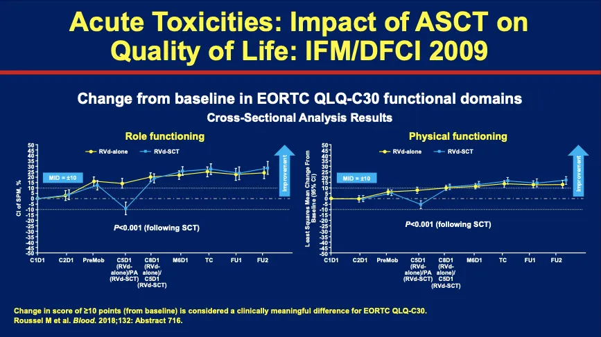 The core question is if triplet therapies with transplant are better or if quad therapies without transplant (or delayed transplant) would be equally effective and less toxic. The IFM/DFCI study also looked at acute toxicities and their impact on quality of life for those who receive an autologous stem cell transplant.