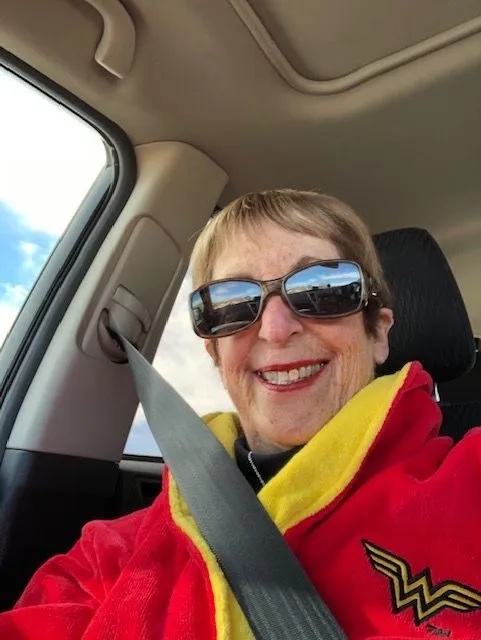 2) My adoption of my avatar, Wonder Woman, who dressed fit to kill in halter top and bikini pants for radiation. I accumulated all the accoutrements of her outfit over these three months—bracelet, crown, magic power bracelet, and oodles of socks. Here “consort” took her out on adventures every weekend no matter how heinous she felt, which she posted on Facebook. Wonder Woman became my moniker and provided me, my friends, and family with a way to laugh through the pain.