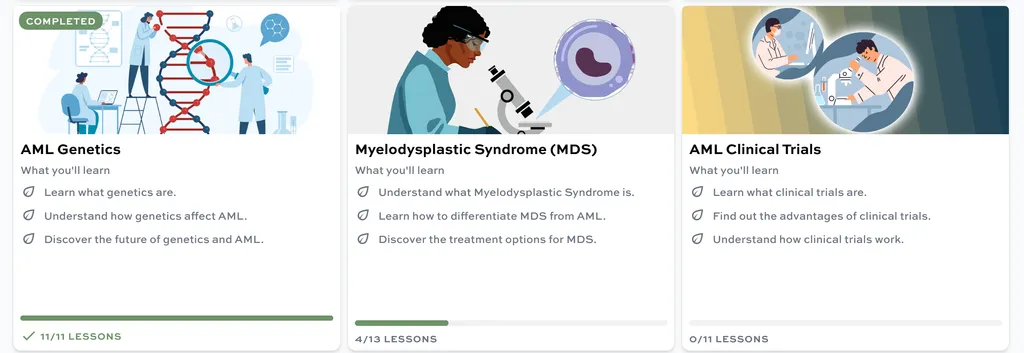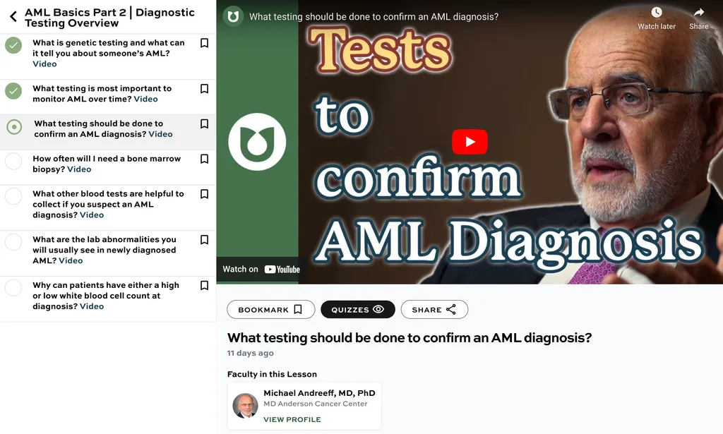 HealthTree University was founded to provide cancer patients with access to high-quality educational resources that are free and easily accessible. The platform is home to hundreds of videos and quizzes recorded by cancer specialists and other experts, covering a wide range of AML-related topics.