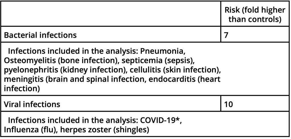 Infection is a serious threat to patients with multiple myeloma. The risk of specific bacterial infections, such as pneumonia and septicemia, as well as viral infections like COVID-19, herpes zoster, and influenza, is higher by 7- 10x in myeloma patients compared to patients without myeloma (Table 1). The risk of dying from an infection is also significantly elevated for a myeloma patient compared to controls.1,2