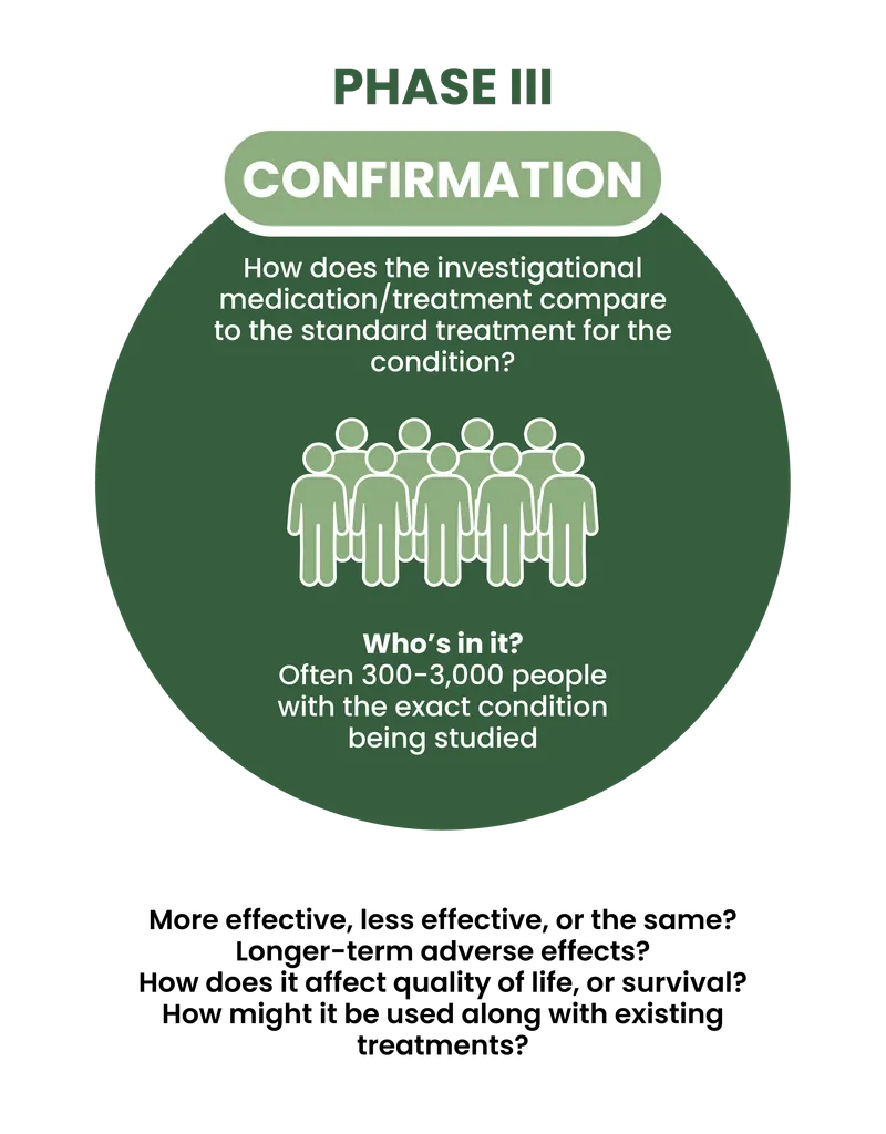 Phase III trials are large-scale studies that compare the new treatment to the current standard of care, with an emphasis on confirming effectiveness and long-term safety.