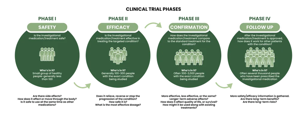 Clinical trials progress through four main phases, each with specific goals and endpoints that build on the previous phase’s findings. As trials advance, endpoints evolve from basic safety measures to detailed effectiveness and quality-of-life outcomes, ultimately guiding the treatment's approval and real-world use.