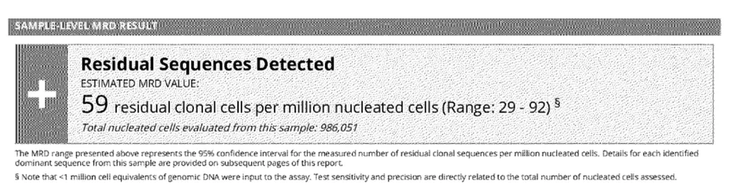 1. Sample-Level MRD Result or MRD status: This is the most valuable piece of information that your test will give you. Here, it will indicate whether or not you are MRD positive or negative. In other words, it will tell you whether this test detected any myeloma cells in the sample that was provided.