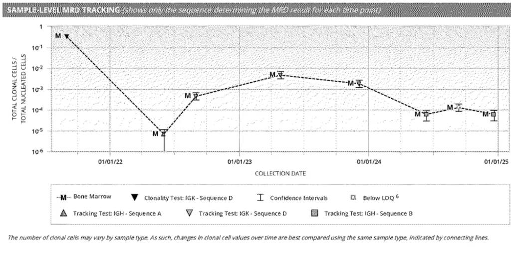 2. Sample-Level MRD Tracking or MRD Trend: If this is your first MRD assessment, this section is included in your first MRD result and then the subsequent MRD results are tracked. However, if you have received multiple clonoSEQ results, you will be able to track the trends of your MRD results over time, which is as important as being positive or negative.