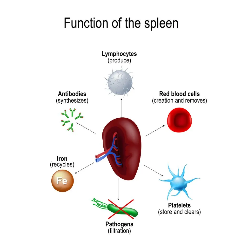 It works as a filter, getting rid of old, damaged, or misshapen red blood cells. It is part of the lymphatic system, a network of tissues and organs that help the body remove toxins, abnormal cells and pathogens.