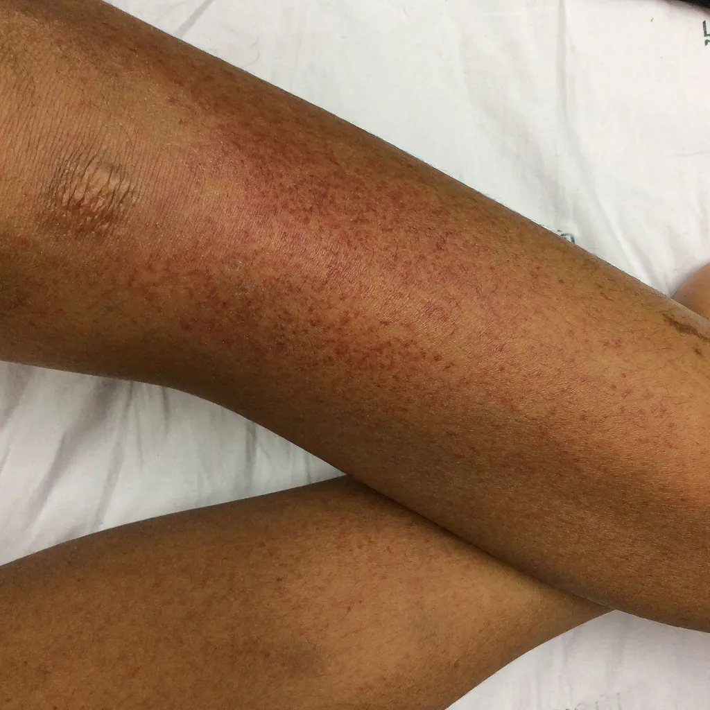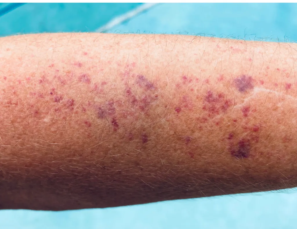 Petechiae are tiny red, purple, or brown spots under the skin caused by the rupture of small blood vessels called capillaries. They are very small and often found in arms and legs. When this bleeding affects larger areas under the skin, it is known as purpura. These symptoms occur due to low platelet levels, which impair the blood’s ability to clot.