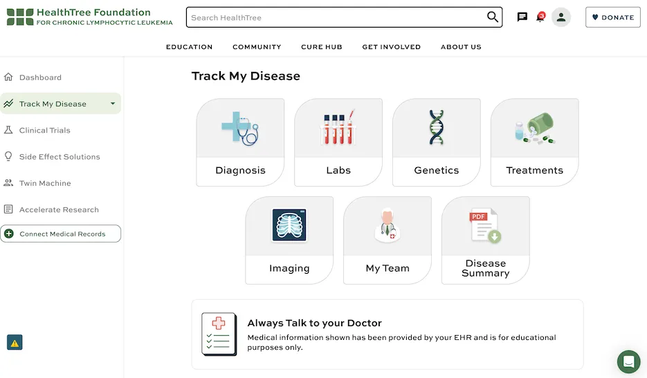 Once your records are connected, you are then able to track your CLL labs, images, and trends through the HealthTree Cure Hub "Track My Disease Labs" feature.