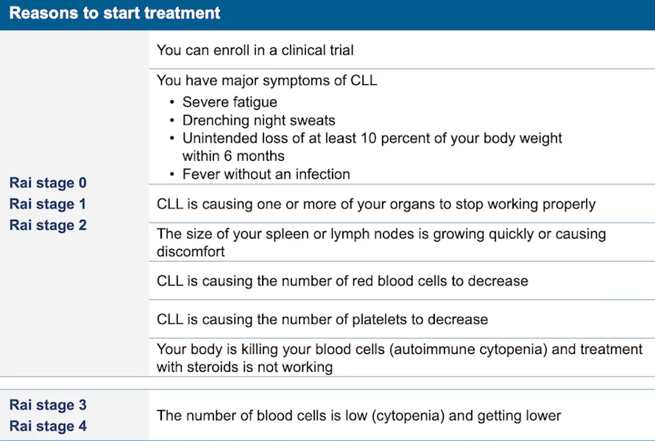 Treatment for CLL begins once one of the following is present (read more about the staging system for CLL here):