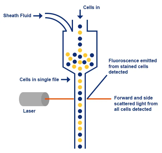 To check for the protein pattern, the CLL patient’s doctor will complete a flow cytometry test. This is done by taking a sample of the patient’s blood and mixing it with a solution that includes fluorescent dyed antibodies to attach to each of the CLL cell’s specific proteins (CD5, CD19, CD20, and CD23). The sample is placed into the flow cytometer machine and the cells move single file past a laser. As the laser shines on each cell, the fluorescent antibody markers that have attached to the cell’s proteins will illuminate their dyed color. The computer records information from the test.