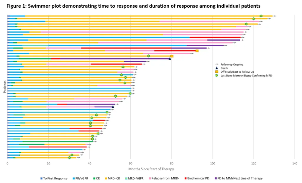 The swimmer plot graphic above (Figure 1.) provides an excellent visual representation of the study’s findings. Each line represents a patient in this trial, with the yellow portions on the plot highlighting the time each patient remained in the optimal response, minimum residual disease negative complete response (MRD negative CR). Conversely, the red and purple areas identify whenever a patient progresses from smoldering myeloma to multiple myeloma.