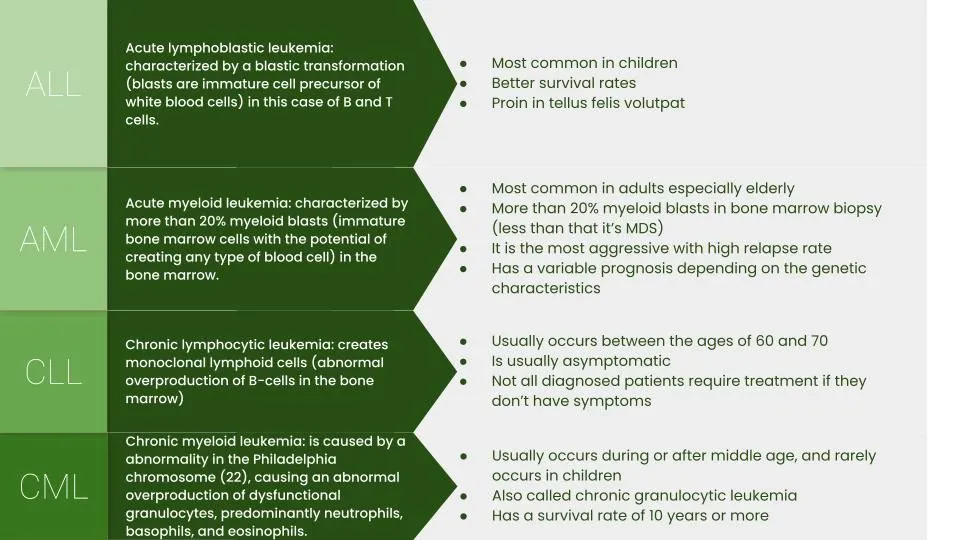 Each is characterized by different characteristics in the cells that evolve into cancer cells and the age group in which they are commonly diagnosed. Knowing their genetic characteristics can also help researchers develop new ways to treat leukemia to increase the patient’s survival rate and quality of life.