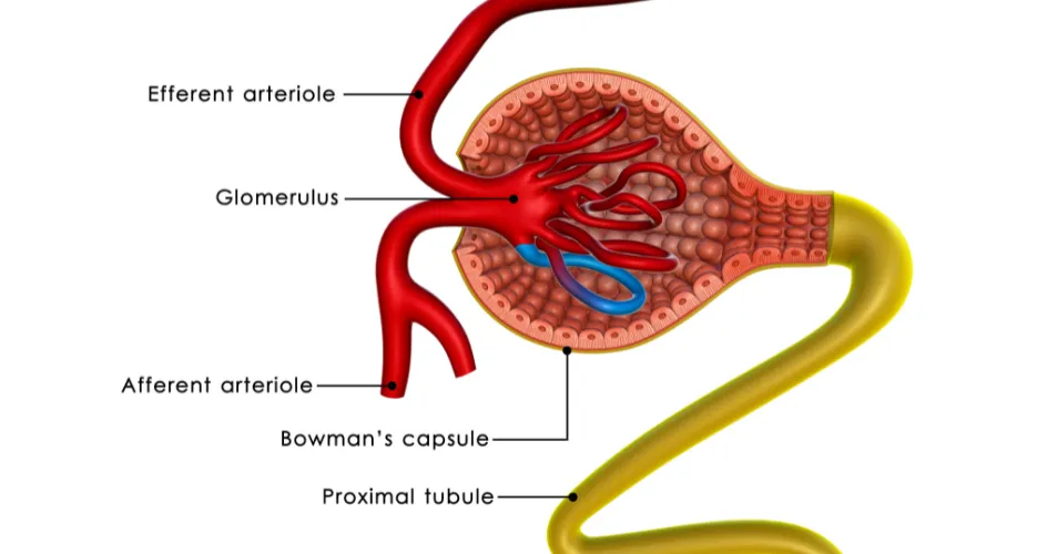 The kidneys are made up of millions of nephrons. Each nephron contains two parts, the glomerulus and the tubule.