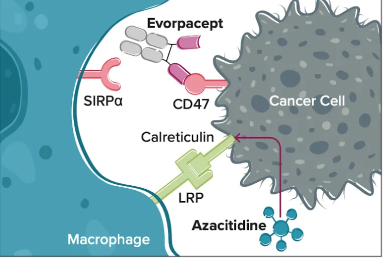 Image retrieved from: ALX Oncology (2024) A Study of Evorpacept (ALX148) With Azacitidine for Higher Risk Myelodysplastic Syndrome (ASPEN-02). The image illustrates how CD47 protein expressed by cancer cells is blocked by evorpacept, that way, a receptor in macrophages (immune system cells that eliminate cancer cells or infected cells), can identify the cancer cell that was camouflaging as a “good” cell with CD47, and in combination with azacitidine, the bind becomes stronger since it aids another receptor acting in this immune response.