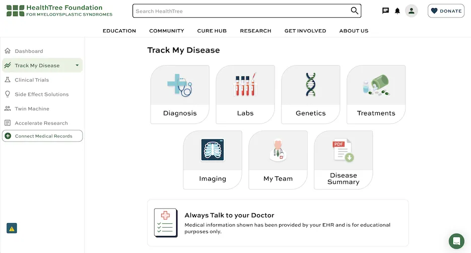 Once your records are connected, you are then able to track your MDS labs, images, and trends through the HealthTree Cure Hub "Track My Disease Labs" feature.