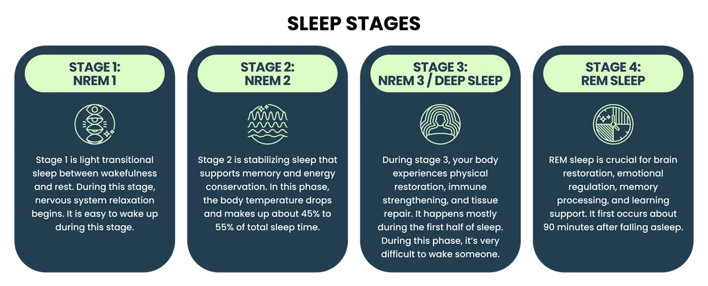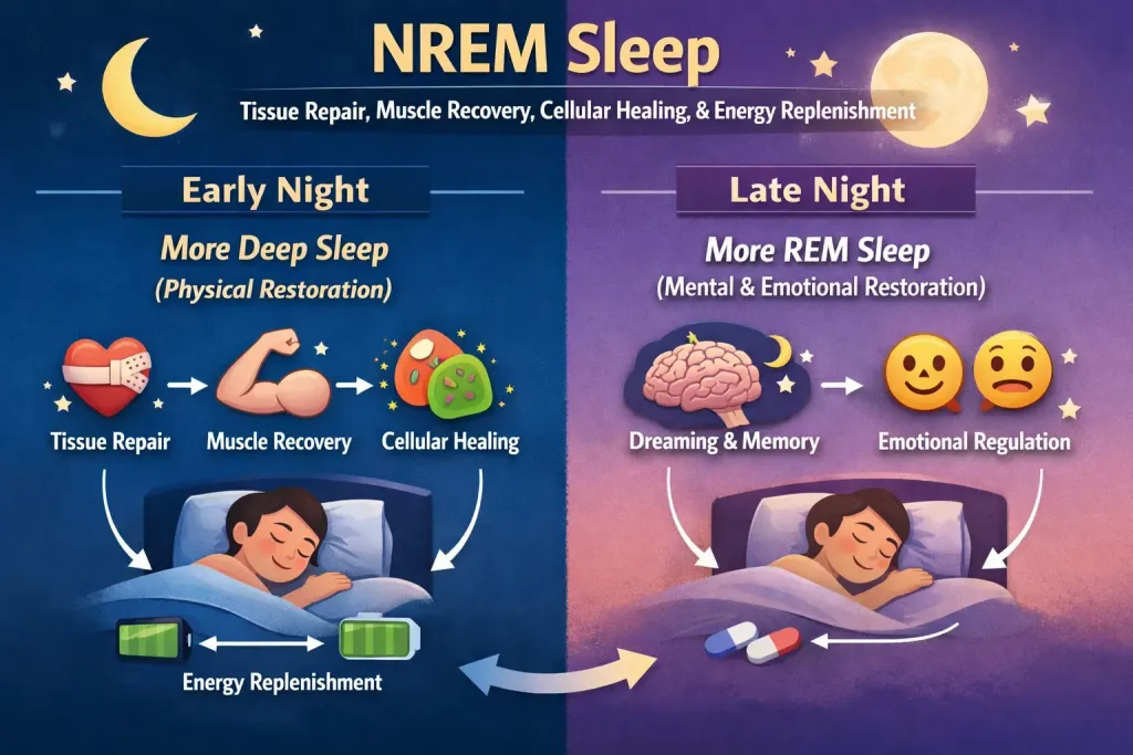 In the first half of your sleep cycle, the body spends more time in deep non–rapid eye movement (NREM) sleep. This stage is essential for physical restoration. During NREM sleep: