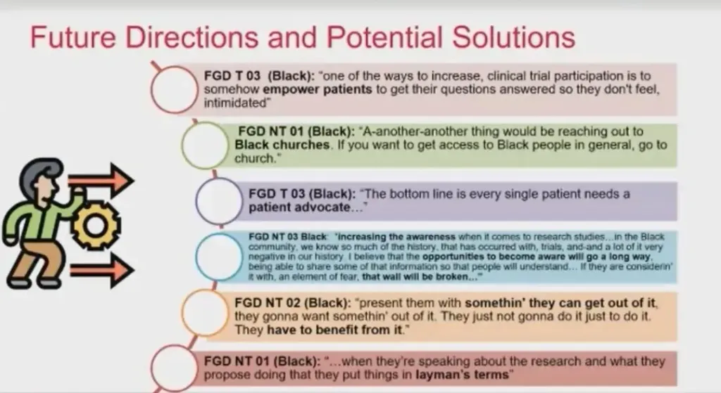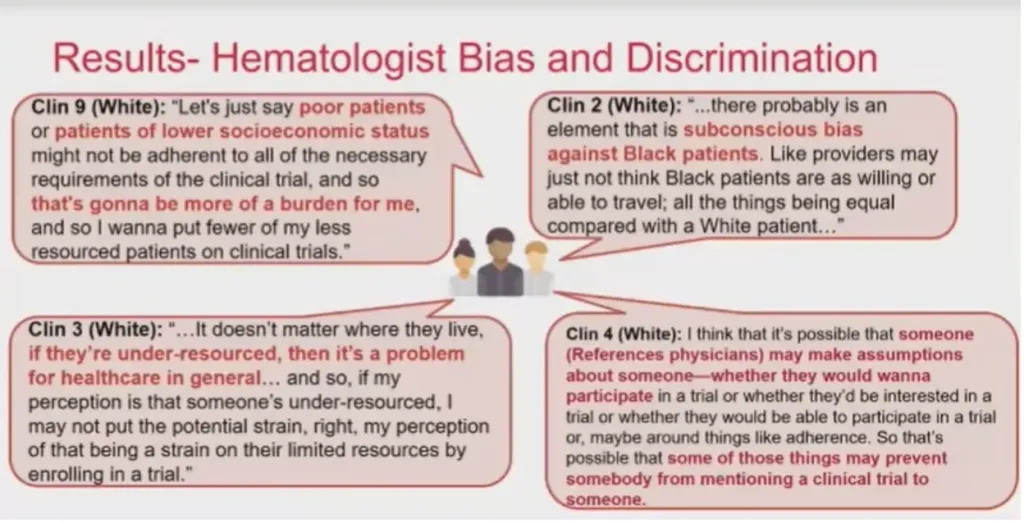 The study concludes that hematologist bias, stereotyping, and discrimination influence the decision to offer clinical trials to Black patients. The use of the word "trial" for Black patients was potentially stigmatizing and left them elements of feeling like a guinea pigs or experimented on. Trust at multiple levels is critical to enhancing the enrollment of Blacks participants in clinical trials.