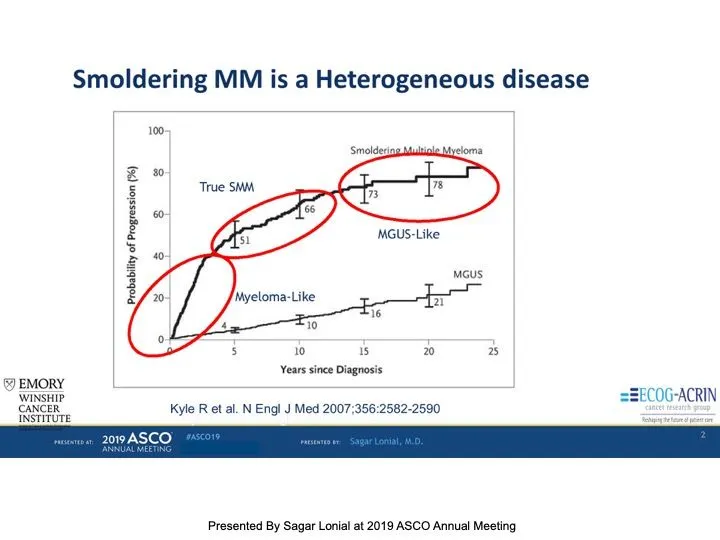 Some smoldering myeloma behaves more like MGUS, an earlier precursor condition. Some behaves like active myeloma. Understanding when and who to treat is an active area of myeloma research. Dr. Lonial noted: