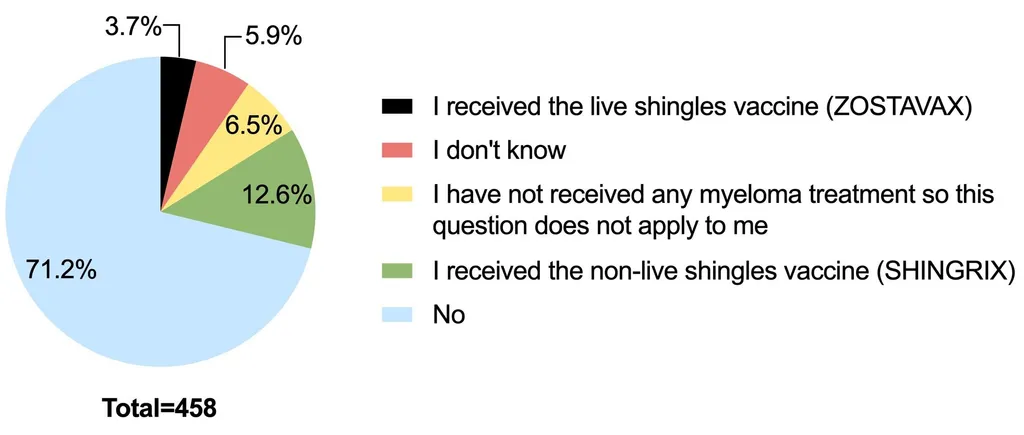 The majority of myeloma patients did not receive a shingles vaccine, which was surprising. A few patients recieved the live shingles vaccine (which is not recommended for myeloma patients). Patients should ask their doctor if they should receive the dead version of the shingles vaccine.