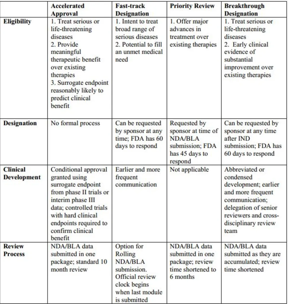 Just the other day the Janssen CAR T product Cilta-Cel was given Priority Review status and now Teclistimab was given a Breakthrough Therapy designation. These are only two of four FDA Expedited Review Programs. Below is a brief chart summarizing the differences. If you would like to learn more about the various program distinctions click on this link: