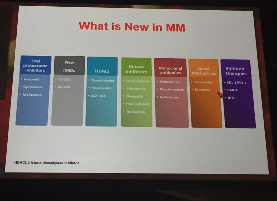 On this slide entitled “What is new in MM”, they list a total of 21 drugs. If we subtract the 4 approved in 2015, we have 17 new drugs in the clinical trial testing stage of development. This is awesome, and few malignancies have anything close to this exceptional level of new drug development. Last year it was the monoclonal antibodies which took center stage. It seems that no matter what you combine Darzalex (daratumumab) with, this combo crushes the standard of care which it is compared to. In addition, in a trial as a single agent it showed an overall response rate of 30% in a heavily pretreated population. Myeloma specialists were over the moon with excitement. Few single agents have ever been this effective in this heavily pretreated population.