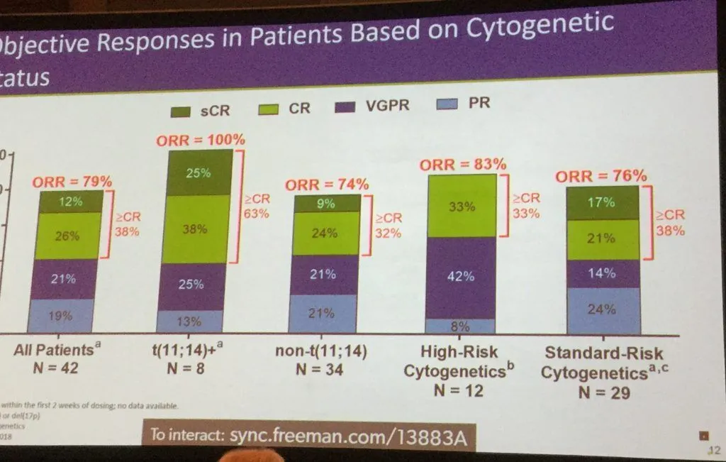 As in the single agent study, this combination has an excellent overall response rate for myeloma patients with a translocation of (11;14). A 100% response rate with 63% greater than complete response (CR). It shows outstanding results even in those with high risk cytogenetics (which includes the deletion of 17p). This a very important addition to the high risk treatment armamentarium.