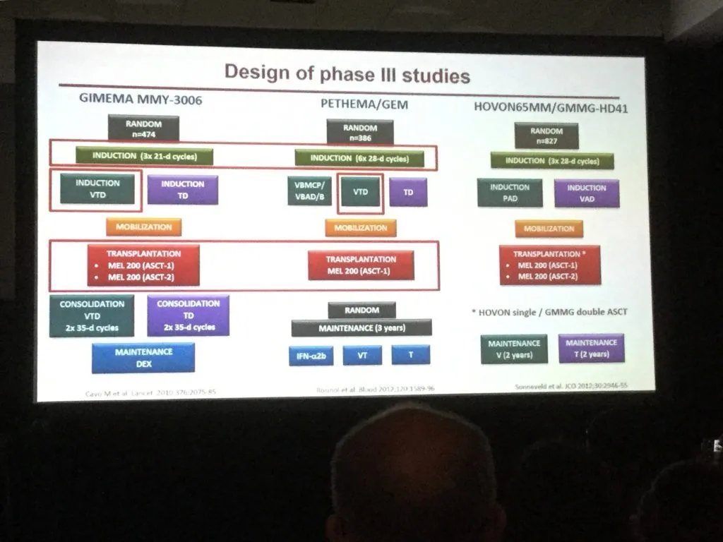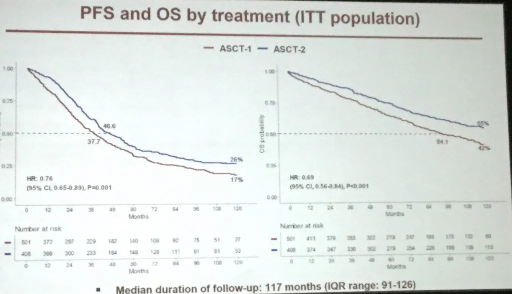 As long as I have a member of the myeloma patient community there has always been discussion of the role of transplant as well as the number of transplants. Two prior studies had shown exactly opposite conclusions. Both study had differing designs, however both had elements of Velcade/Revlimid/Dex (VRD) induction, and as have previously found it to be a better response than Vincristine/Doxorubicin/Dex (VAD) or Revlimid/Dex (RD).So the data was sliced and diced to make it as comparable as it could be, and then both studies were consolidated into one. Michele Cavo, MDN, Professor of Hematology Bologna University School of Medicine, Head of Myeloma Research Unit, Seràgnoli Institute of Hematology Bologna, Italy presented the following abstract.Double Vs Single Autologous Stem Cell Transplantation for Newly Diagnosed Multiple Myeloma: Long-Term Follow-up (10-Years) Analysis of Randomized Phase 3