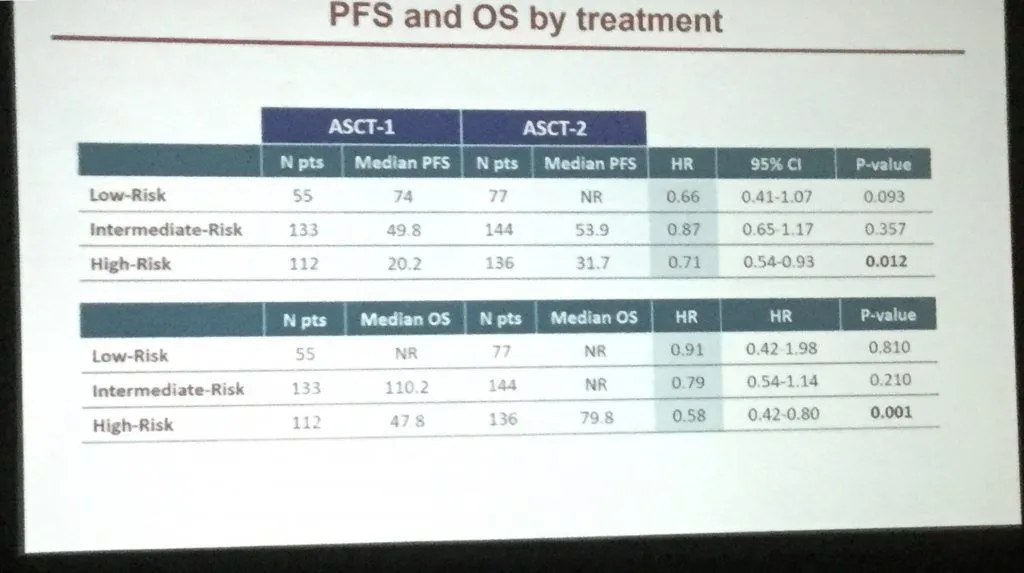 The design of the studies was as noted in the picture below:Some of the key results are noted in the next two images:As can be noted, an amazing overall survival difference exists in favor of two transplant over one for the high risk group. So it appears transplant is not dead nor is the use of two transplants. Dual transplant provides a 7 plus year overall survival vs. 4 for the single transplant. Looks like we won’t be done with transplant any time soon.