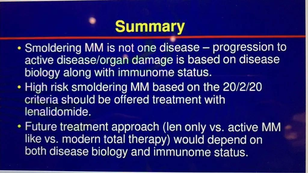 - The need to eliminate Smoldering Myeloma as a category as it’s on the continuum from Monoclonal Gammopathy of Undetermined Significance to Active Myeloma