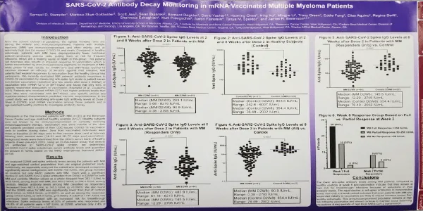 Dr. Samuel Stampfer MD, PHD presented a “Poster Abstract,” which is a summary of his study encapsulated on one large poster. He wanted to address a subject we myeloma patients are curious about: how we respond to the new mRNA COVID-19 vaccines.