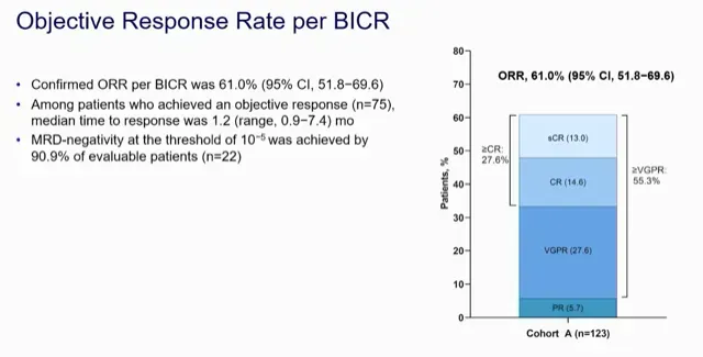 Like most BCMA-directed therapies, the time to response was short, at 1.2 months. The overall response rate was 61%, with 53% achieving at least a very good partial response and 27% reaching a complete response or better. Of those patients achieving a response, 91% were MRD negative, with the MRD positive patients largely being those with extramedullary disease and those with ISS stage 3.