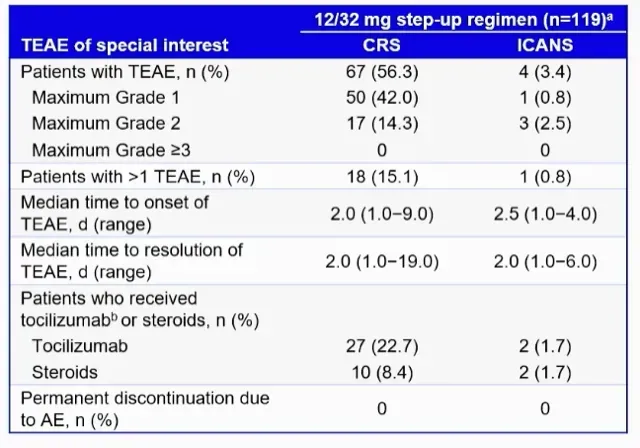 The incidence of grade 1/2 CRS was initially 87%, but with modification of dosing, this dropped to 67% (the drop not reflected in the table below) with no cases of grade 3 or 4. One feature that stands out in the immunotherapy field is that there were no cases of ICANS reported in MagnetisMM-1.