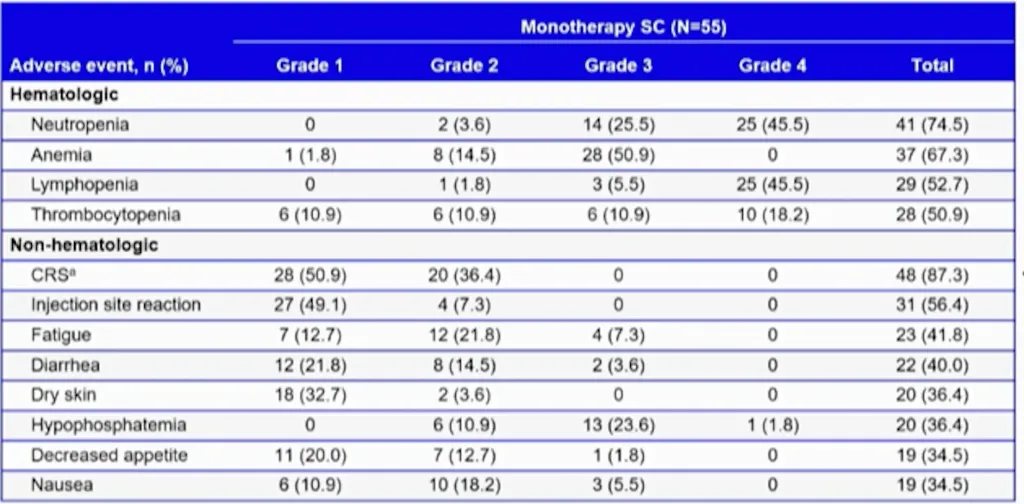 The safety profile demonstrates low and predictable rates of CRS with very little ICANS. Hematologic side effects were significant, with an infection rate of 66.7% and 35% demonstrating higher-grade infections. The median onset of infections was 47.5 days.