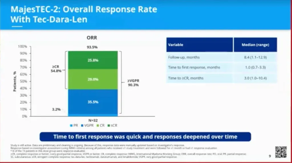 The overall response rate to this treatment at a median of 8.4 months was impressive at 93.5%. Recall that by itself, teclistamab had a 61.8% overall response rate alone in the MajesTEC-1 study.