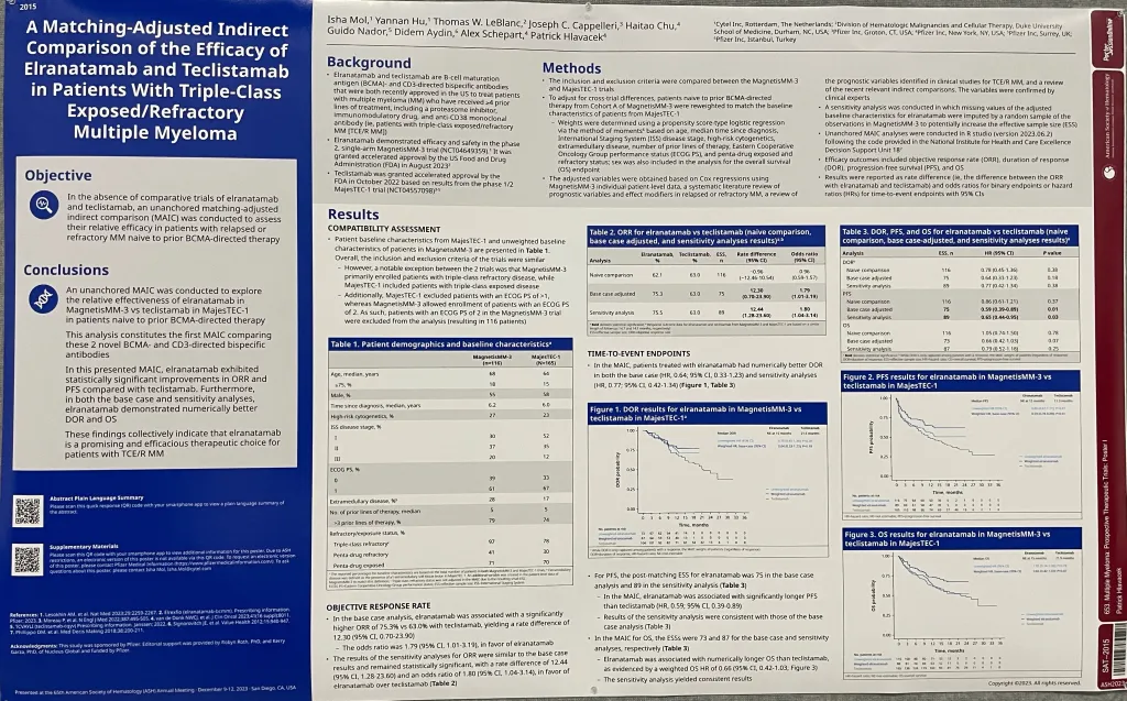 This study, presented at the ASH 2023 conference as a poster abstract, is a match-adjusted indirect evaluation for two FDA-approved novel B-cell maturation-antigen (BCMA) and CD3 bispecifics you may have heard good news about, elranatamab and teclistamab.