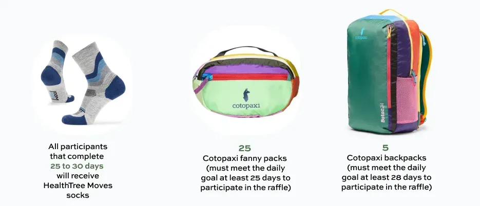- 5 raffle participants will receive a Cotopaxi backpack (must meet daily goal 28 out of 30 days)