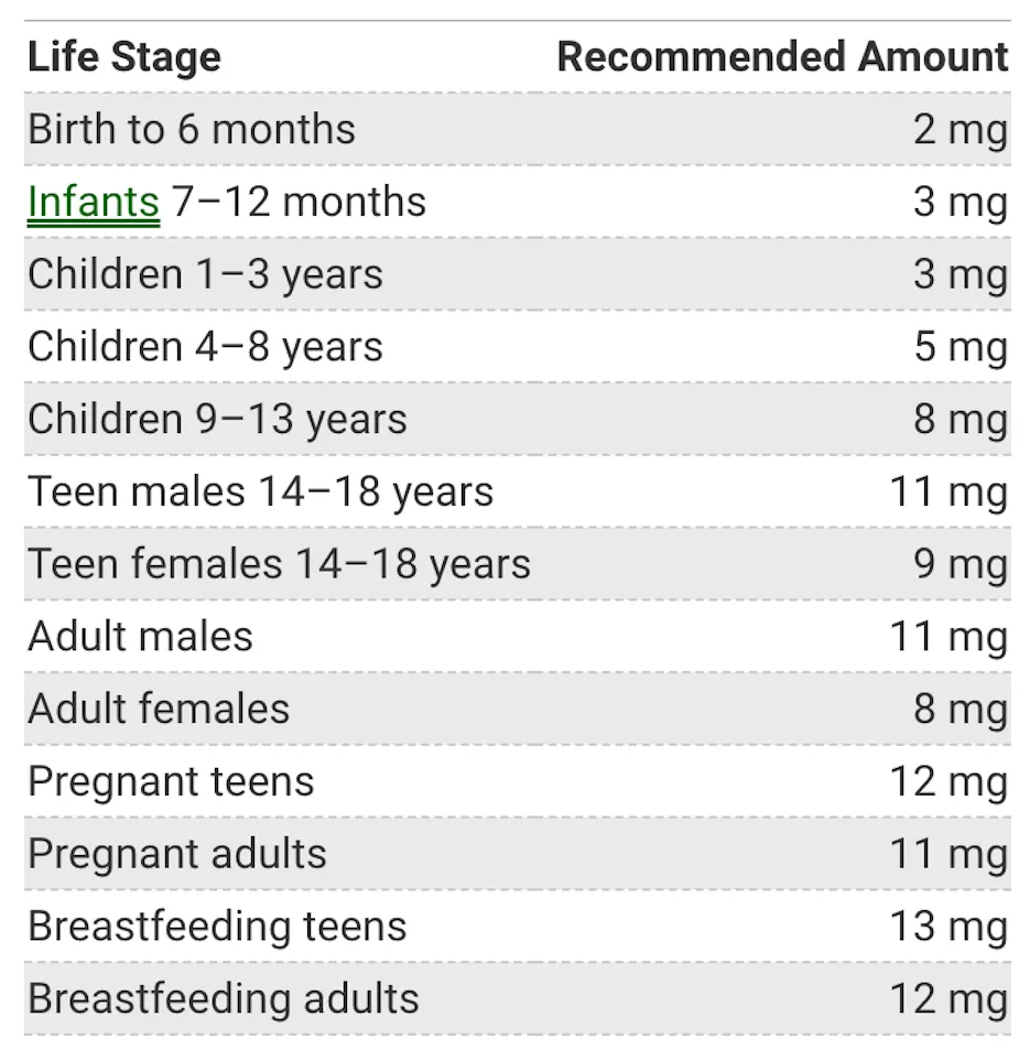 Daily zinc recommendation in milligrams (mg):