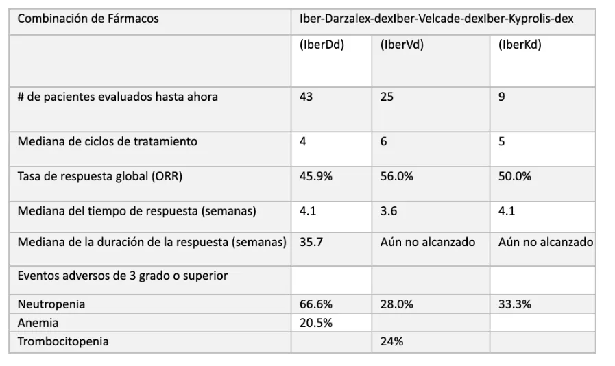 En la última reunión de la Asociación Europea de Hematología, se presentó una actualización provisional de la eficacia que tiene el iberdomida en combinación con estos otros fármacos. Los resultados que se dieron a conocer hasta ahora se resumen en la tabla siguiente: