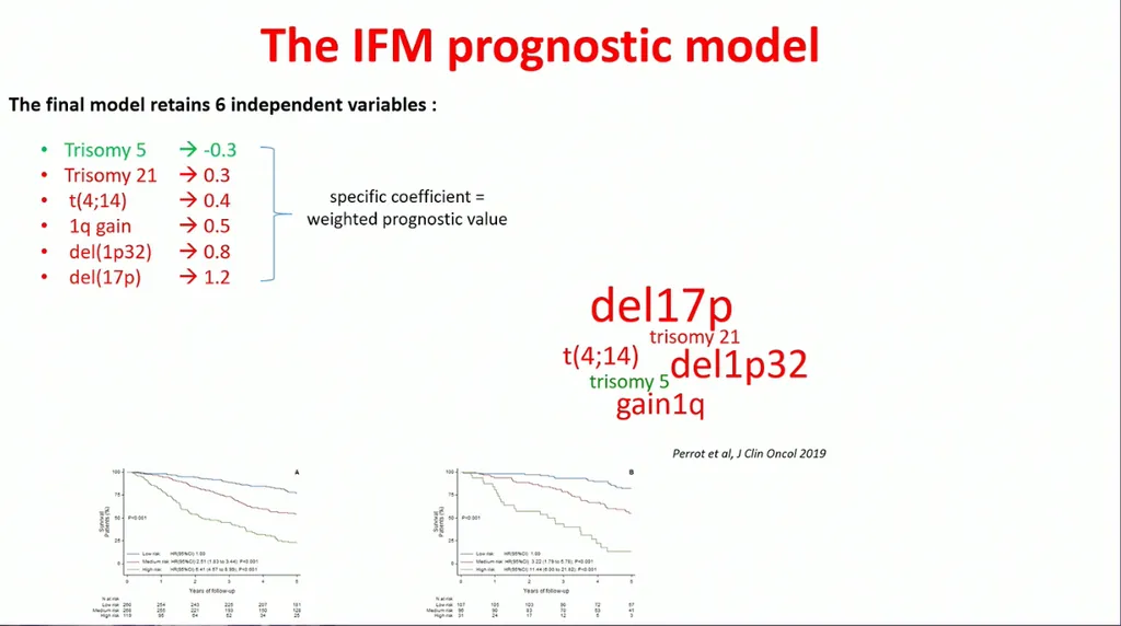Dr. Aveg-Loiseau shared that t(14;16) was a translocation found early in a myeloma diagnosis, and it was only found in 3.5% of myeloma patients. He questioned whether it was an independent factor in prognosis. He noted that this was not the case in the IFM/DFCI 2009 study. In a 2018 study from ASH on 213 patients (the largest study to date), the median survival was 88 months (7.3 years). He doesn't believe t(14;16) should stay in the definition of high risk.
