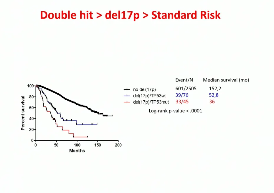 For the last 20 years, the deletion of 17p has been thought to be high risk. However, we know from the MMRF COMPASS study that patients who have only one 17 chromosome missing behave as standard risk patients while those missing both 17 chromosomes behave as high risk. The European group did research on more than 1,000 del(17p) patients and found that patients who have more than 55% of del(17p) in their plasma cells are high risk while those who have less than 55% of del(17p) are not high risk. Dr. Avet-Louiseau also reviewed if having only del(17p) was equally high risk to patients who also had the TP53 mutation in addition to the del(17p).