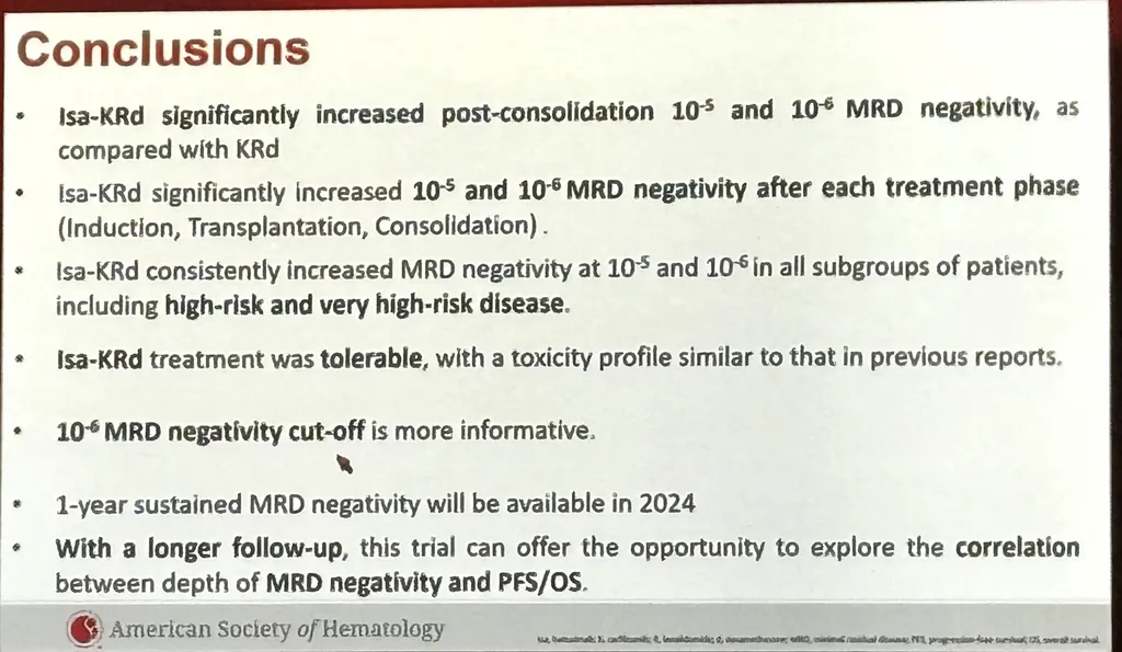 The authors concluded the quadruplet combination of isatuximab (isa) plus KRd [carflizomib, revlimid, dexamethasone], performed significantly better than the triplet combination of KRd when looking for any myeloma cells at the 105 level (1 in 100,000) or 106 level (1 in 1,000,000). The addition of isatuximab did not add any safety profile risks to the combination. This benefit was also shown in the high-risk myeloma patient population in the trial.