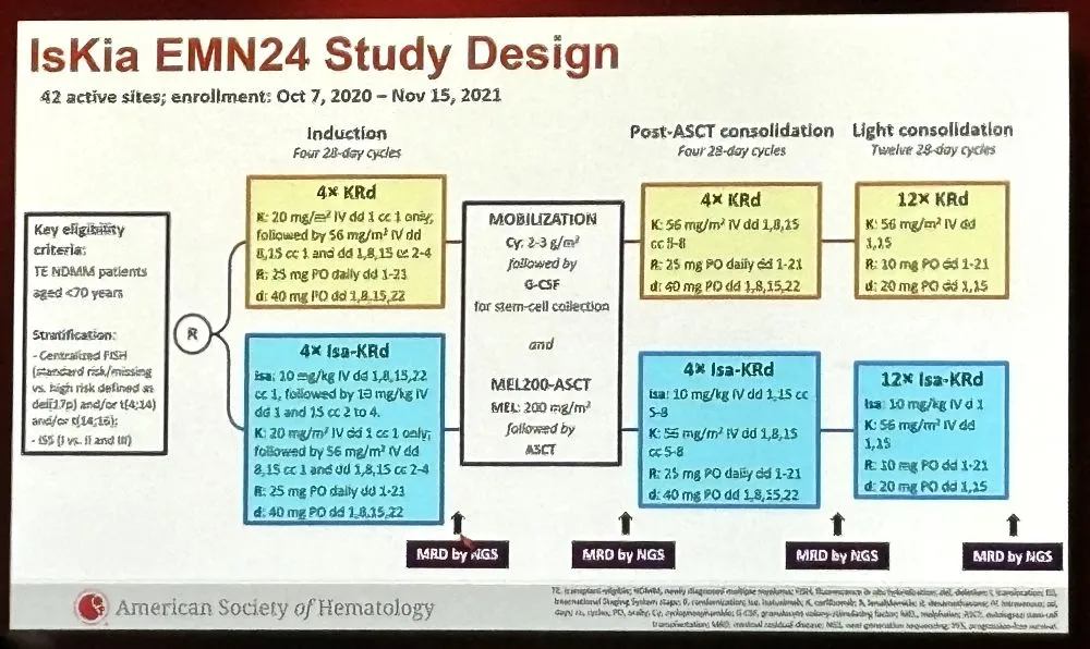 302 patients were randomized to receive the treatment combinations of Kyprolis(K); Revlimid(R), Dexamethasone(d), and/or Isatuximab(Isa) as outlined below. The brand name of Isa is Sarclisa. MRD assessment was done after induction, transplant, and twice during consolidation. Patient characteristics were well-balanced between the treatment groups.