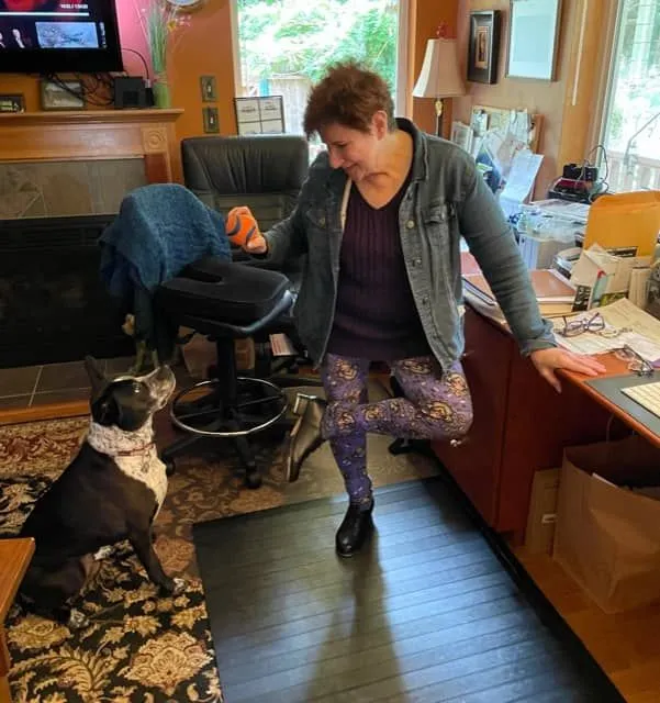 An ad came over my social media for virtual tap dance classes. I was hooked and I already had the equipment. The ‘class kit’ came with a portable mat, discs, a connection via the computer, and slip-on tap shoes. I started slow, sitting at first and taking each class for 2 weeks so I knew I was stable. By the third week, I was able to stand and hold onto the desk and follow the routines. I was moving – I was making a joyful noise! Even my dogs were into the classes. Every time I took out the mat and put on my shoes my dogs would see that as their cue to bring their toys into the office where I was ‘taking class’. They would sit and play with their toys while I took the class.
