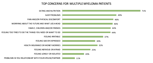 Top concerns for myeloma patients at that early stage centered around diet and nutrition. Sleep issues were the second most common concern. Almost half of myeloma patients were concerned about what the future would hold and 44% were concerned about their family members.