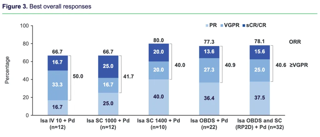 The Phase III study has two arms of the study: pomalidomide/dex with a subcutaneous administration of isatuximab vs. pomalidomide/dex with an IV administration of isatuximab with 2:1 patients trying a subcutaneous injection. The trial will include over 500 patients who have relapsed after two prior lines of myeloma therapy. For the subcutaneous administration, both a shot and the new on-body system were compared.