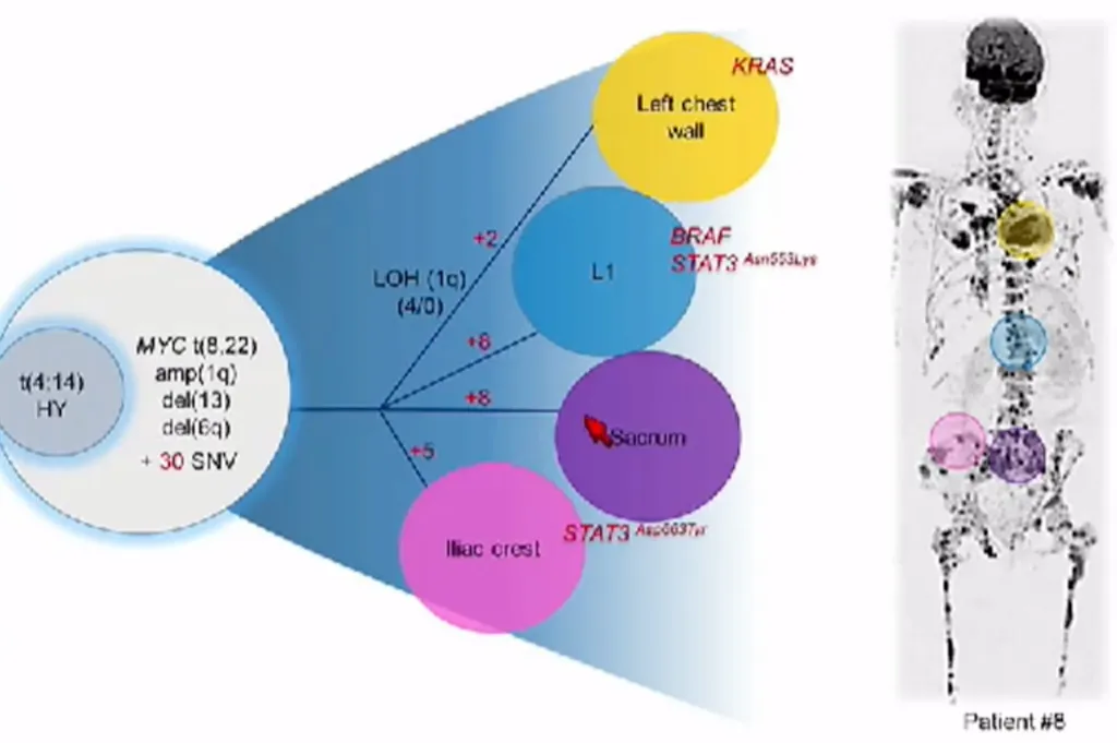 In her presentation, Dr. Davies showed how different genetic types of myeloma can be found in the body in different places. Even though some of the locations in the body share some genetic features, as the cells adapt to their new environment, each environment is different, creating different development of the myeloma over time in various parts of the body.