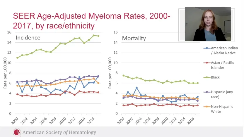 What risk factors affect the progression of MGUS to active myeloma in the African American population? Kimberly A. Bertrand, ScD from Boston University concluded at the recent ASH 2020 meeting that we don't have enough data to come to definitive conclusions. She discusses studies reviewing genetics, obesity, income and education levels have not been conclusive in determining why there are such significant disparities in prevalence and in outcomes.