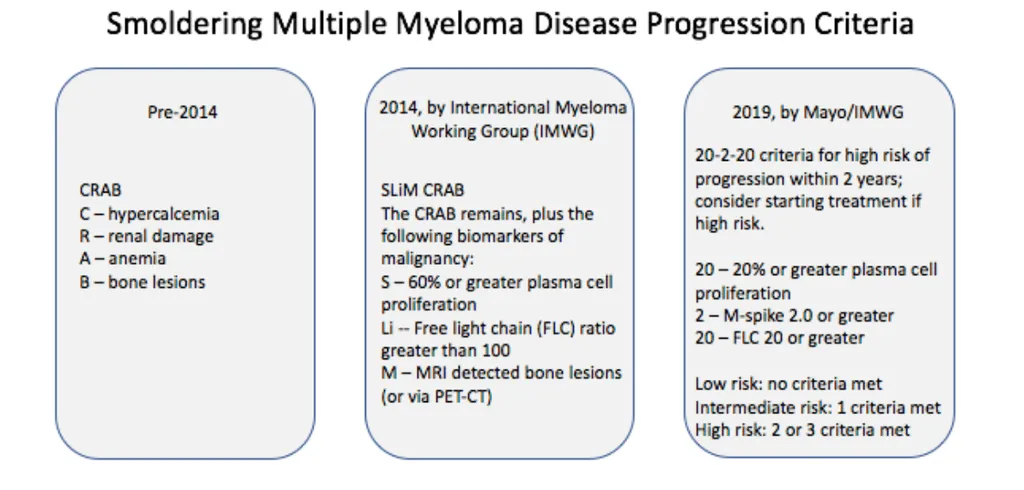 This state of change brings challenges to the surface for many smoldering myeloma patients. As recently as 2014, the criteria for starting treatment shifted. Prior to that, end organ damage was a necessary symptom for initiating treatment (i.e., CRAB criteria, see diagram). Now, three additional indicators are used to determine when to start treatment (i.e., SLiM CRAB). And even more recently, in 2019, new criteria involving three lab values were released, providing a predictive model for high risk of progression within two years (i.e., 20-2-20). These advancements are important to those living with smoldering myeloma, but they also create questions regarding when to start treatment. With many cancers, the answer is clear: a diagnosis is received and the race starts. In the smoldering myeloma world, staying at the starting line is often the best option, but it comes with uncertainty.